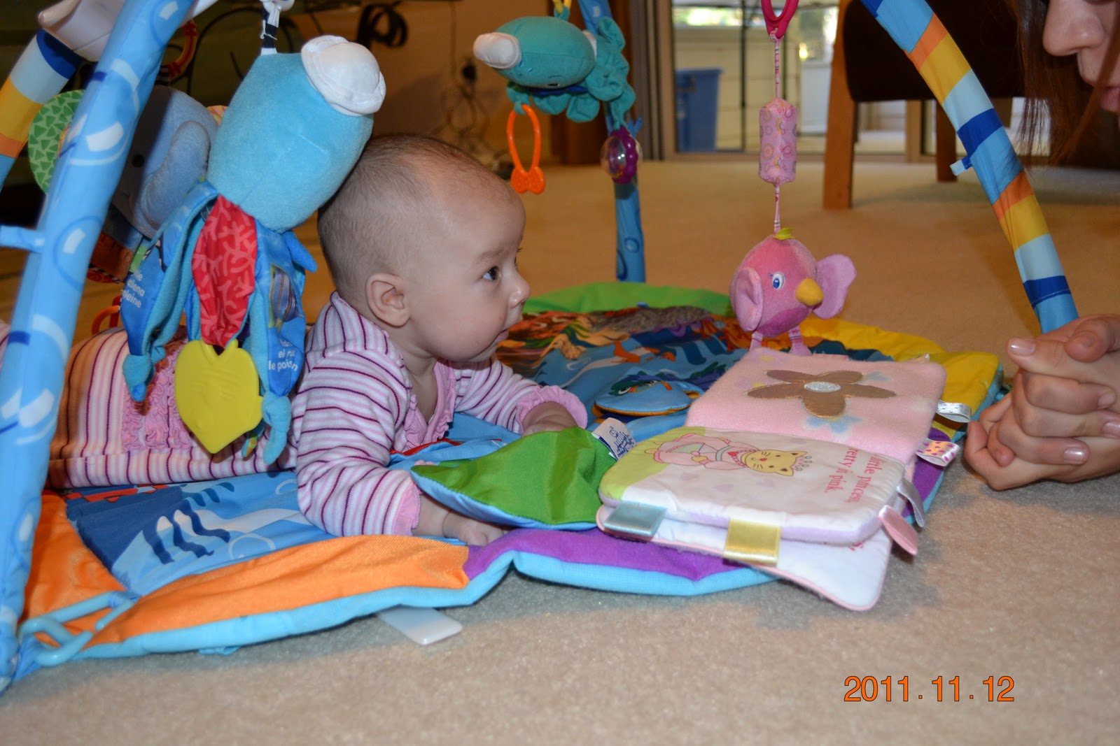 Dylan continues to grow despite our attempts slow her down. She is now great at sitting (assisted) and great in the excersaucer. But her all time favorite activity is standing on mommy and daddy's laps!